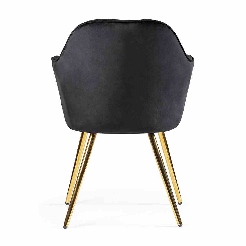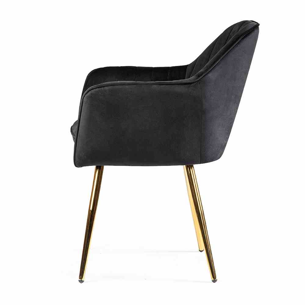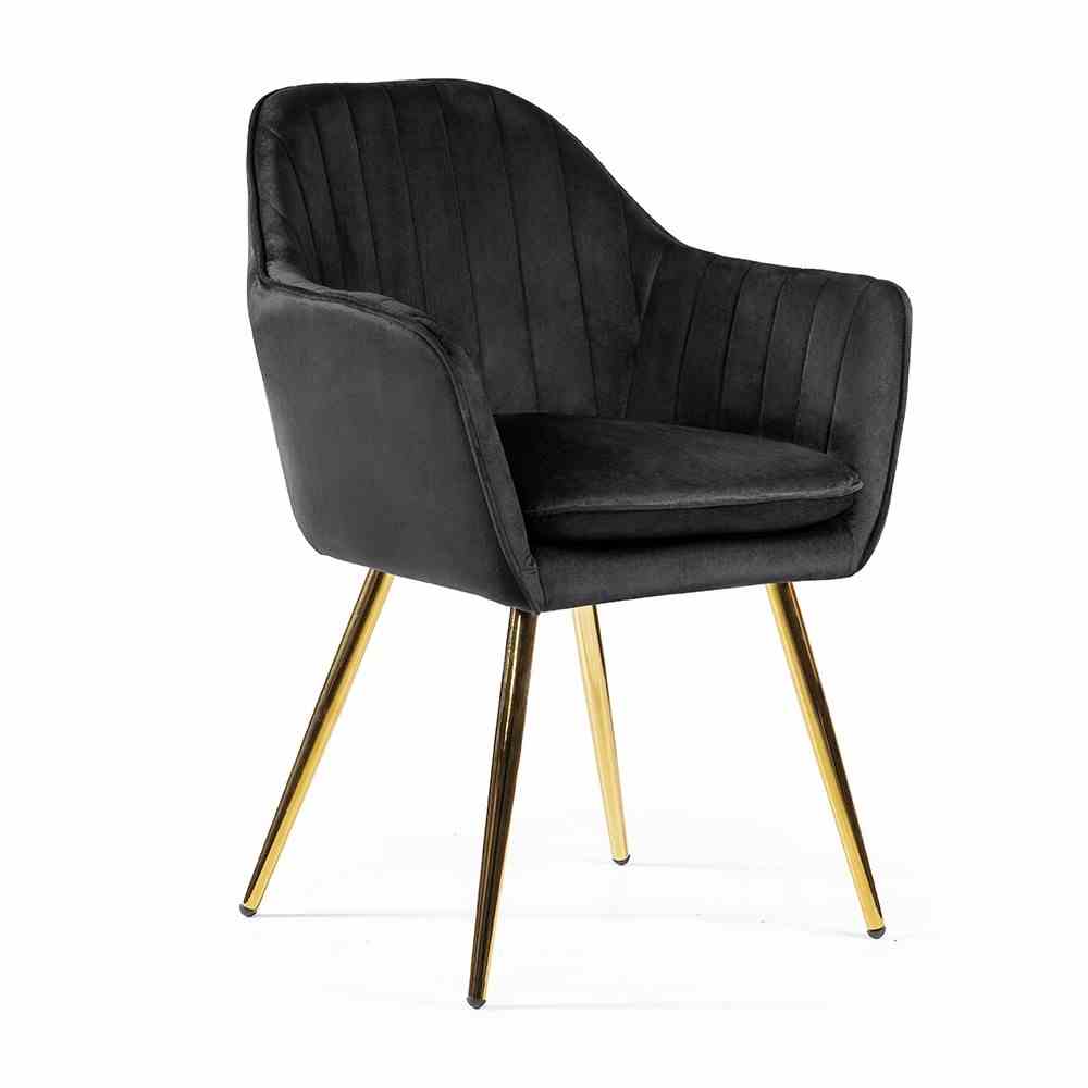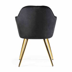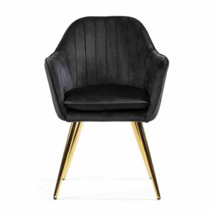 Krzesło Roma o kubełkowym designie tapicerowane jest tkaniną welwetową. Krzesło posiada ergonomicznie przystosowane, wysokie podłokietniki. Całość oparta na metalowych nóżkach w kolorze czarnym.