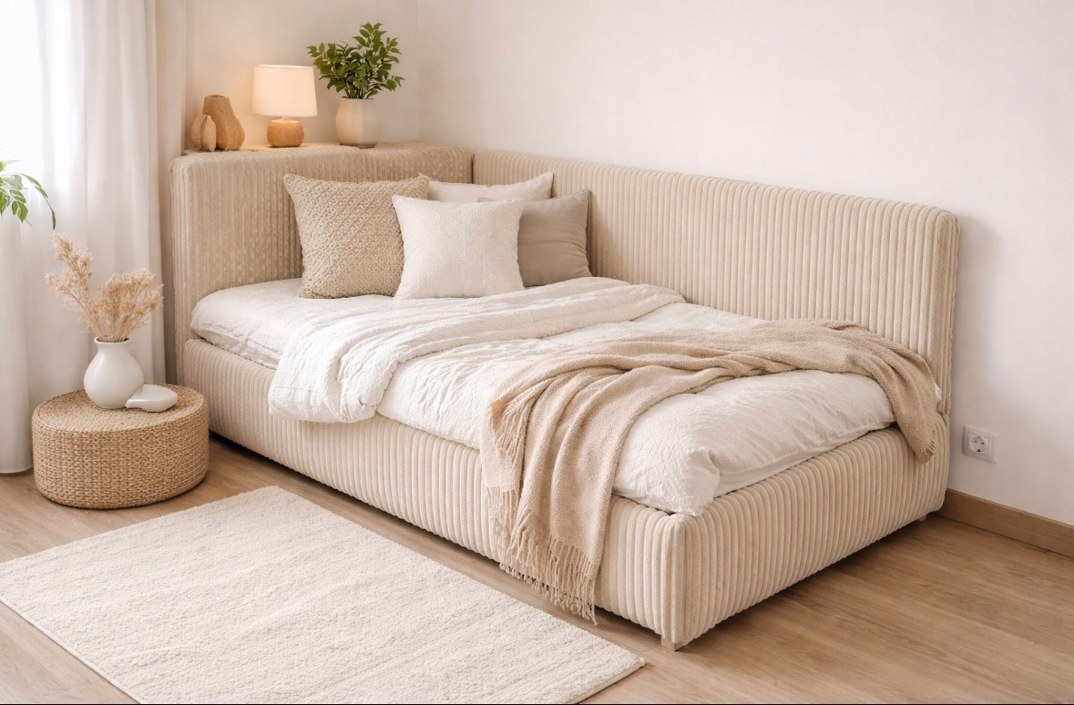 ✔️ Może stać w rogu – w dzień wygląda jak sofa