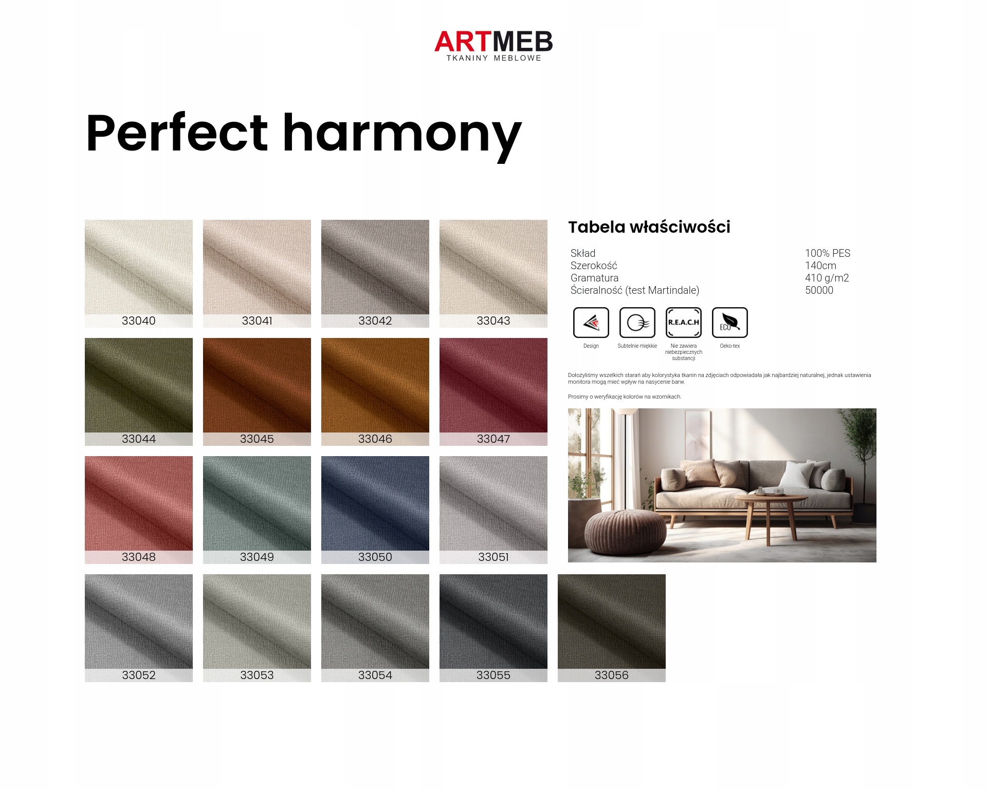 Kremowy Perfect Harmony jest tkaniną pasującą do eleganckich wnętrz. Delikatnie połyskujący materiał szenilowy rozświetli pomieszczenie i nada mu blasku. Oprócz szykownego wyglądu tkanina jest bardzo wytrzymała i nie ma tendencji do mechacenia – można ją stosować nawet na meblach przeznaczonych do intensywnego użytkowania. Spełnia standardy dyrektywy REACH, posiada certyfikat Oeko Tex oraz pozytywnie zdała test papierosa.
