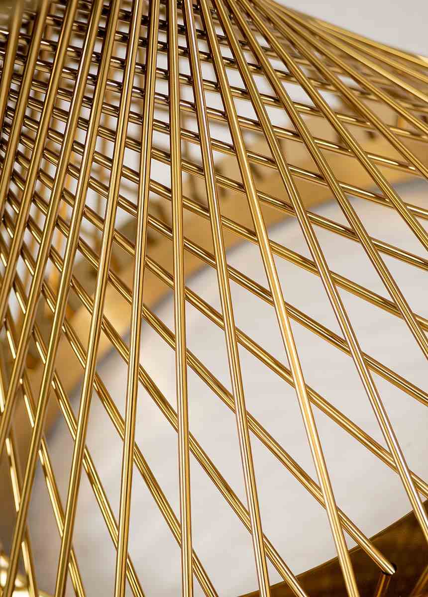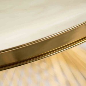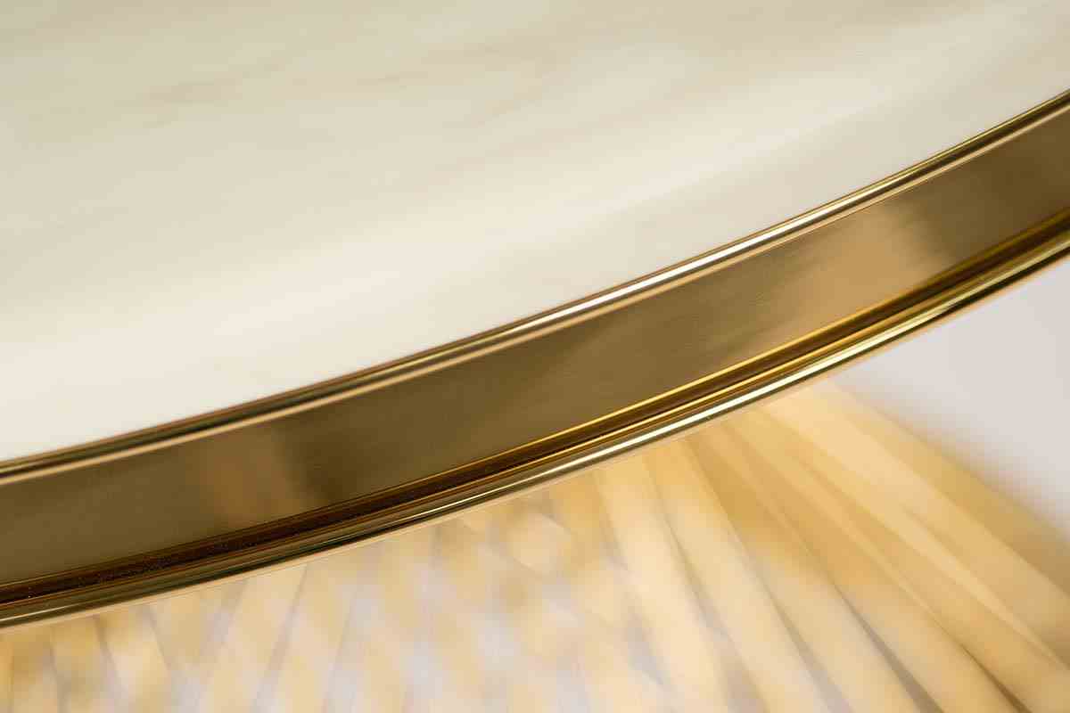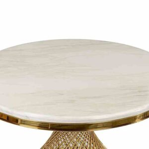 Romance to nowoczesna propozycja do jadalni utrzymanych w stylu glamour. Stół posiada okrągły blat wykonany z kompozytu w kolorze białym z widocznym, niepowtarzalnym wzorem przypominającym marmur. Blat osadzony jest na ażurowej, lecz masywnej nodze ze stali nierdzewnej w kolorze złotym.
