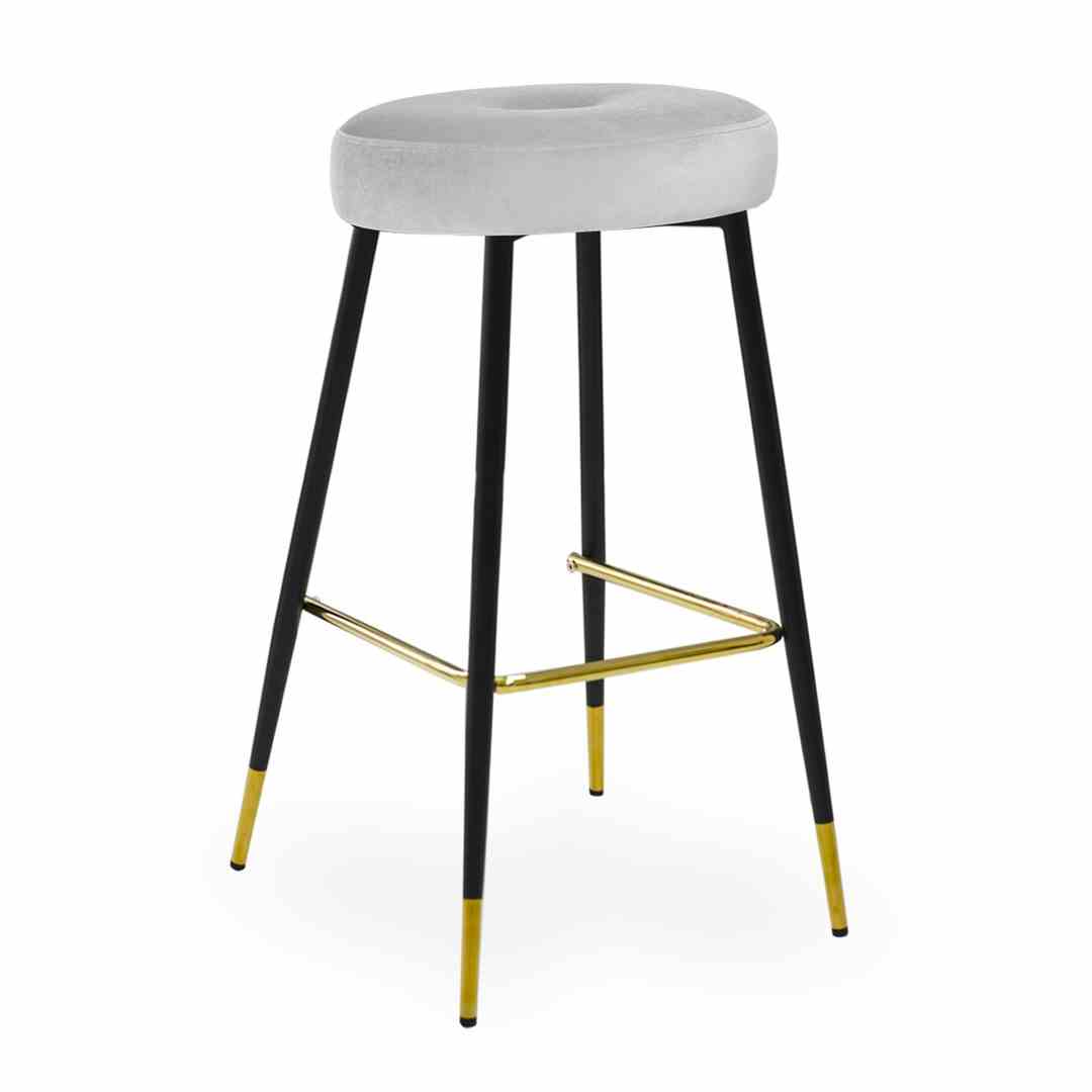 Stołek barowy Consu posiada okrągłe siedzisko z ozdobnym guzikiem na środku i metalowe nogi.